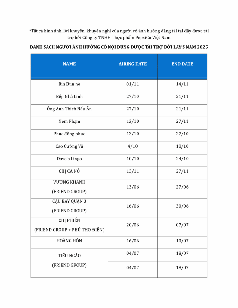 DANH SÁCH NGƯỜI ẢNH HƯỞNG CÓ NỘI DUNG ĐƯỢC TÀI TRỢ BỞI LAY’S NĂM 2025